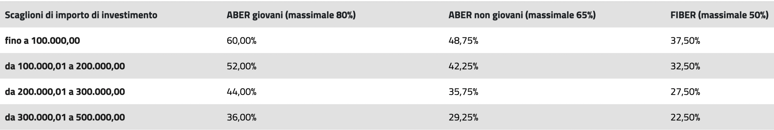 Sono previsti contributi a fondo perduto per l’acquisizione di macchine, strumenti e attrezzature per l’agricoltura, macchine mobili non stradali per agricoltura e zootecnia e trattrici agricole, oltre a investimenti per la pesca e l’acquacoltura. Per le PMI agricole e della pesca che investono nella produzione primaria e nella trasformazione agricola (ABER), nella pesca ed acquacoltura e nella trasformazione ittica (FIBER), il contributo è proporzionale ai costi ammessi secondo la seguente tabella.