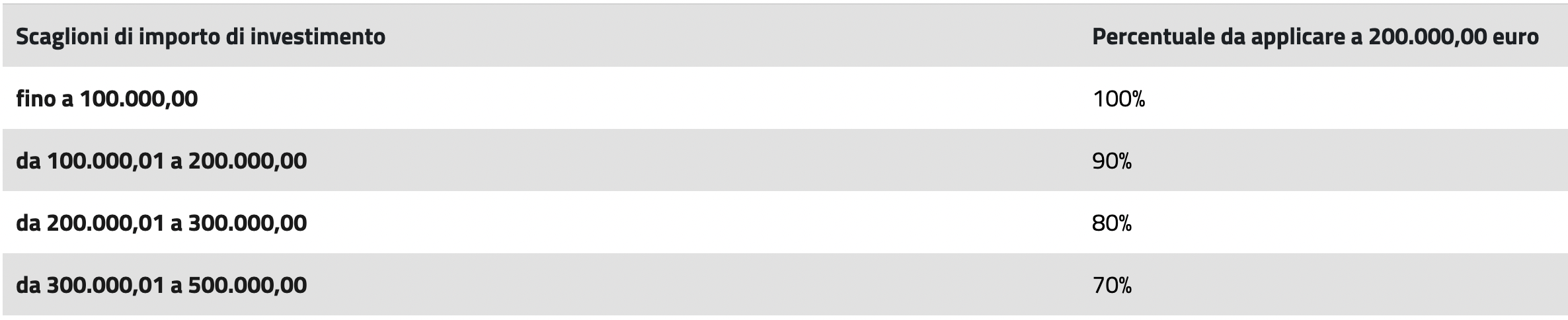 Per le PMI agricole che investono in attività ricadenti negli altri settori o per le PMI agromeccaniche, il contributo a fondo perduto, nell’ambito del de minimis, è quantificato applicando a 200.000 euro una percentuale individuata sulla base dell’importo totale dei costi ammissibili.